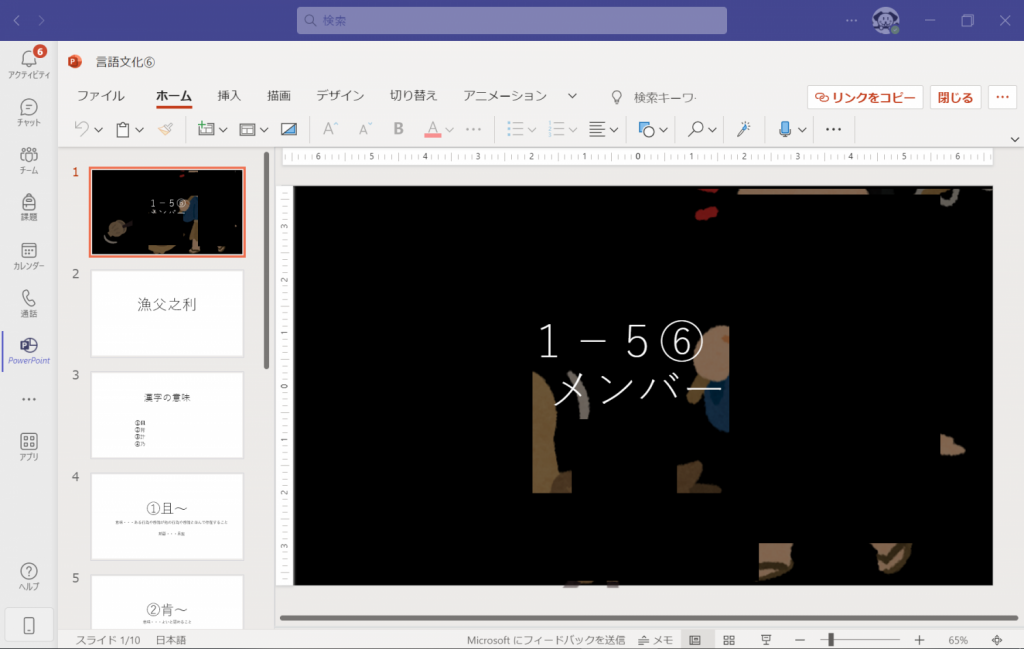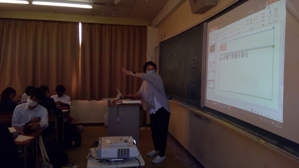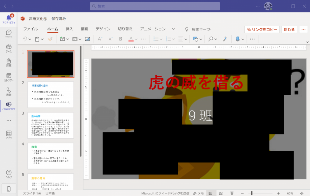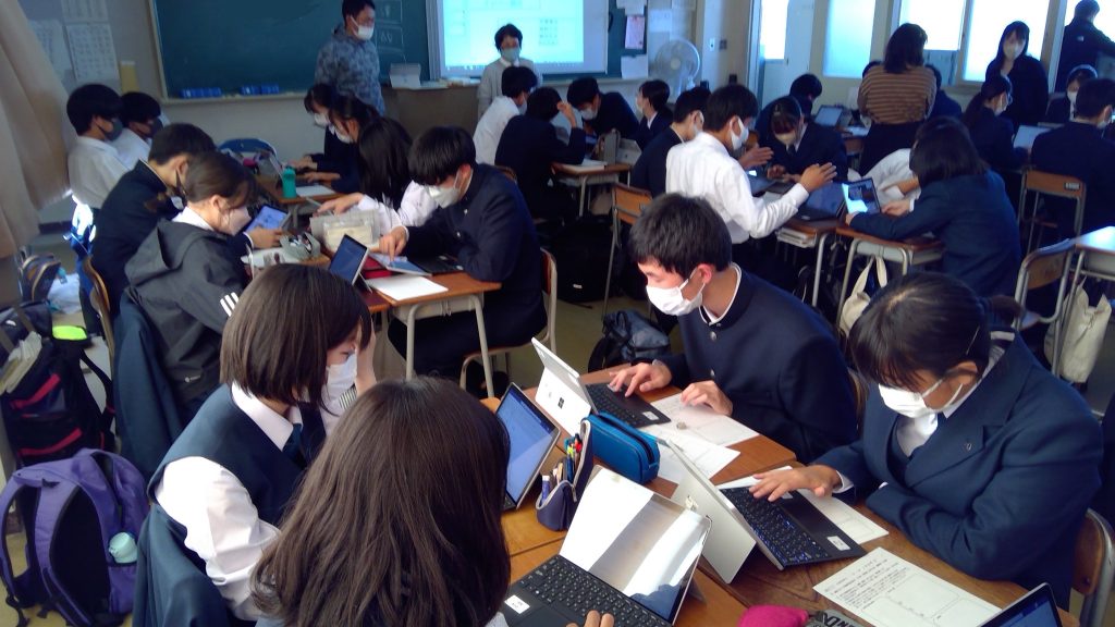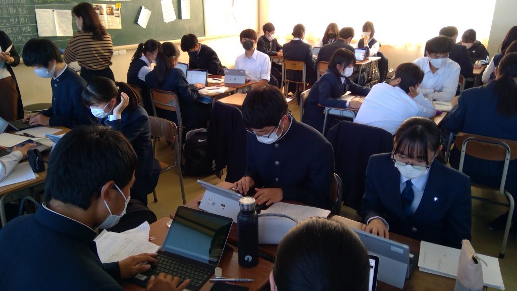 11月11日(金)、1年5組の教室で「言語文化」という科目の研究授業が行われました。「ことばが創られる過程に触れよう」という単元では、生徒が故事成語の寓意をまとめた上で、日常生活や自分の体験の中で使うのにふさわしいシーンを考え、発表をする予定です。今回の研究授業では、その発表のための準備をグループに分かれて行いました。準備には「生徒用タブレット」(Surface Go3)と「Microsoft PowerPoint」を活用しました。