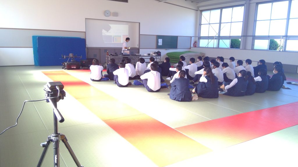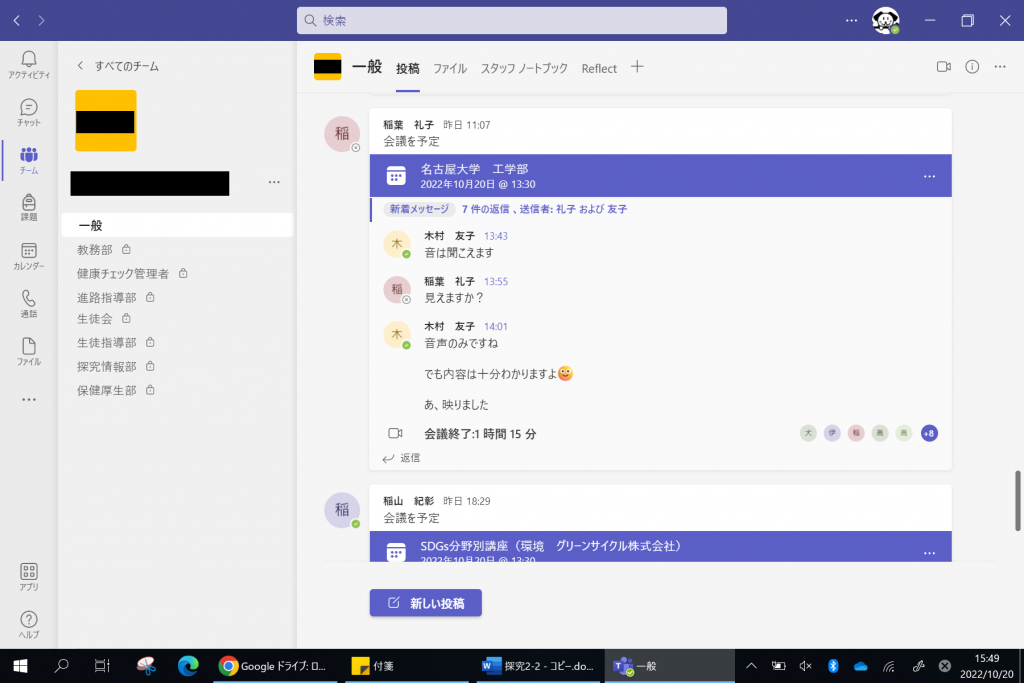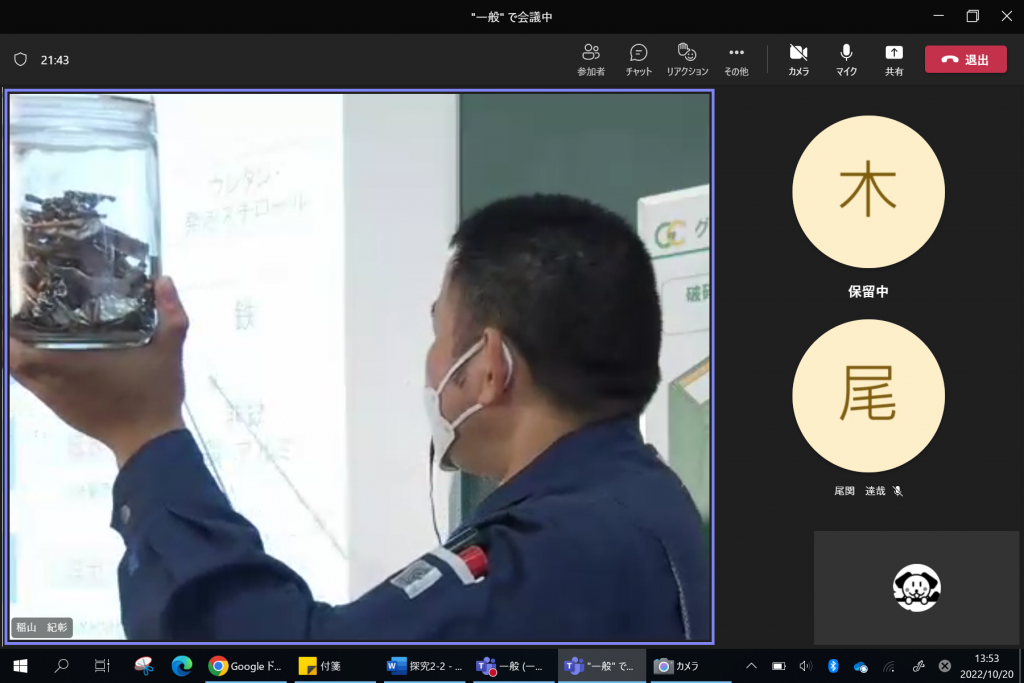 今回新たな試みとして、校内の職員室にいる教員に向けて、オンライン上で授業を同時配信するという実験を行いました。これは将来的に、欠席者の自宅に授業を同時配信することを想定して行われたもので、「Microsoft Teams」の会議機能を利用して、その時間帯に自分自身の授業がない教員に講座へ参加してもらいました。