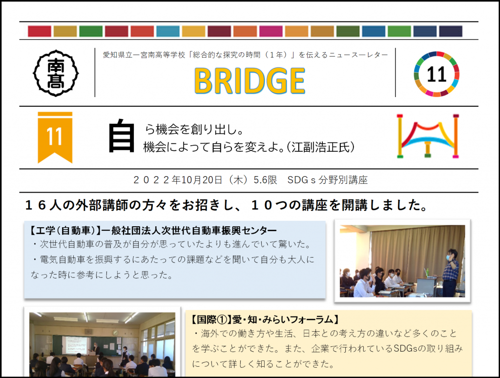 10月20日(木)、第1学年の「探究的な学習の時間」では「SDGs分野別講座」を実施しました。この「SDGs分野別講座」は、民間企業や大学で活躍されている社会人の方を講師としてお招きし、講義をしていただくものです。本年度は名古屋大学工学研究科准教授の後藤圭太先生をはじめ、16名の先生方にお話をしていただきました。講座の様子や受講した生徒の感想などは、「BRIDGE(探究通信vol.11)」及び「BRIDGE(探究通信vol.12)」をご覧ください。