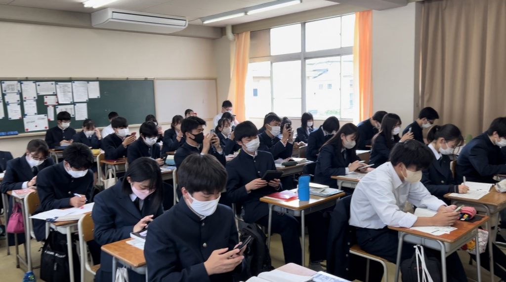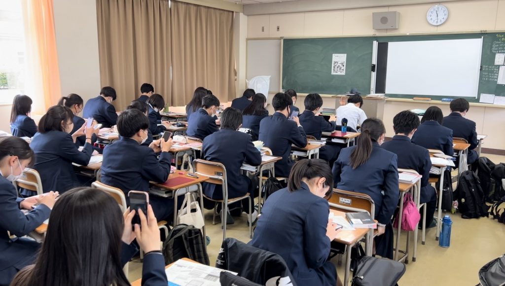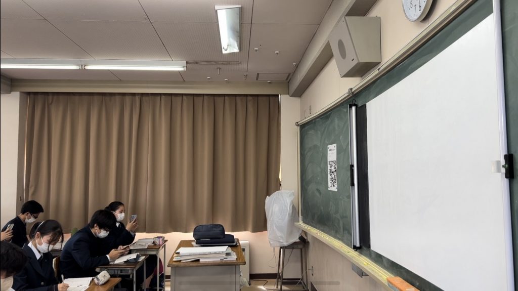 まだ Google Classroom に正しく登録ができていない生徒もいることから、Google Classroom でフォームを配信するのではなく、黒板に入力フォームへのリンクが記載された二次元コードを貼り、生徒のスマートフォンや生徒用タブレットを使って入力させました。
