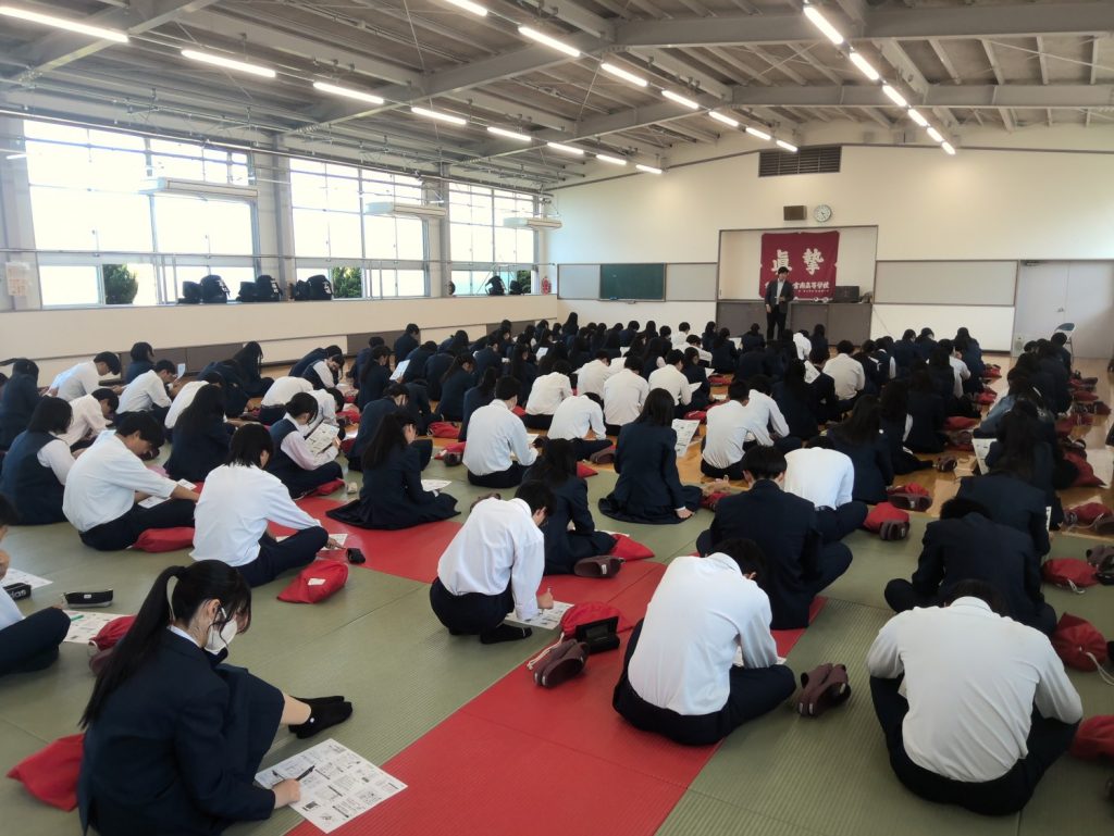 お知らせ/行事レポート 3年生 進路講演会 2025年5月9日 令和7年5月7日(水)7限のLTで、3年生の生徒向けに進路講演会を行いました。 講師には河合塾より西山直志様と柳田了様をお招きし、私立志望(文Ⅰ)と国公立志望(文Ⅱと理系)の2つの会場で、それぞれの入試システムや受験生としての心構え、具体的な勉強法などをお話しいただきました。 生徒はメモを取りながら講演を聞き、受験生としての自覚を強くする大きなモチベーションとなりました。