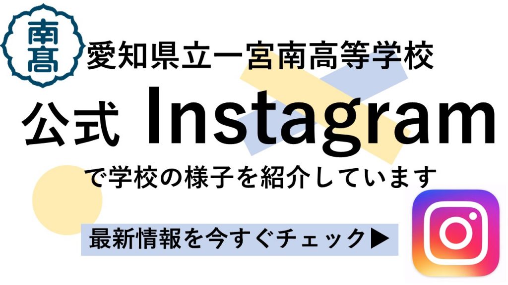 Instagram 2026年1月8日 愛知県立一宮南高等学校公式 Instagram アカウント(一宮南高等学校【公式】) 本校では、公式 Instagram アカウントで、学校行事や授業、部活動の様子を発信しています。是非フォローをお願いいたします。 Instagram アカウント運用方針 個人情報管理・運用規程
